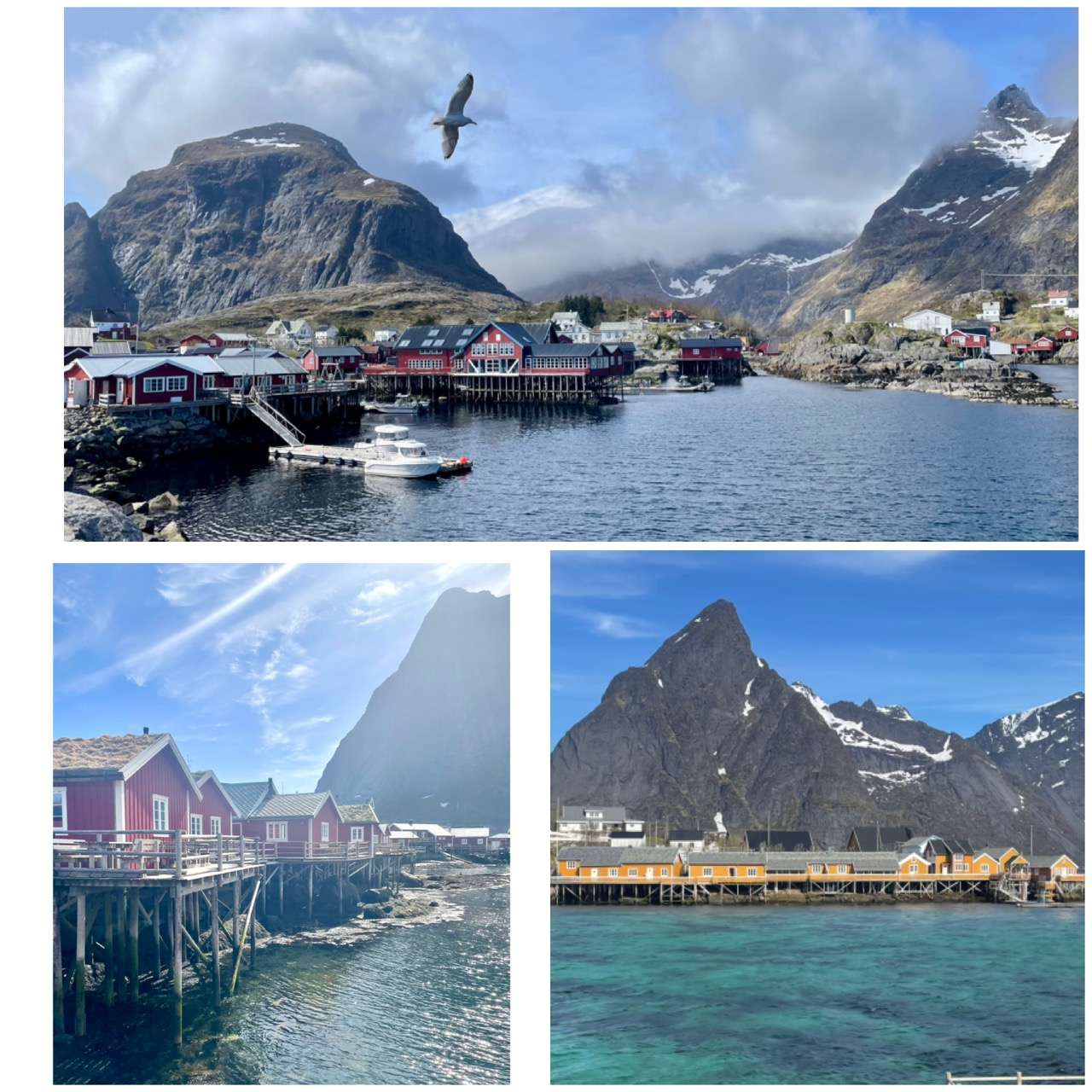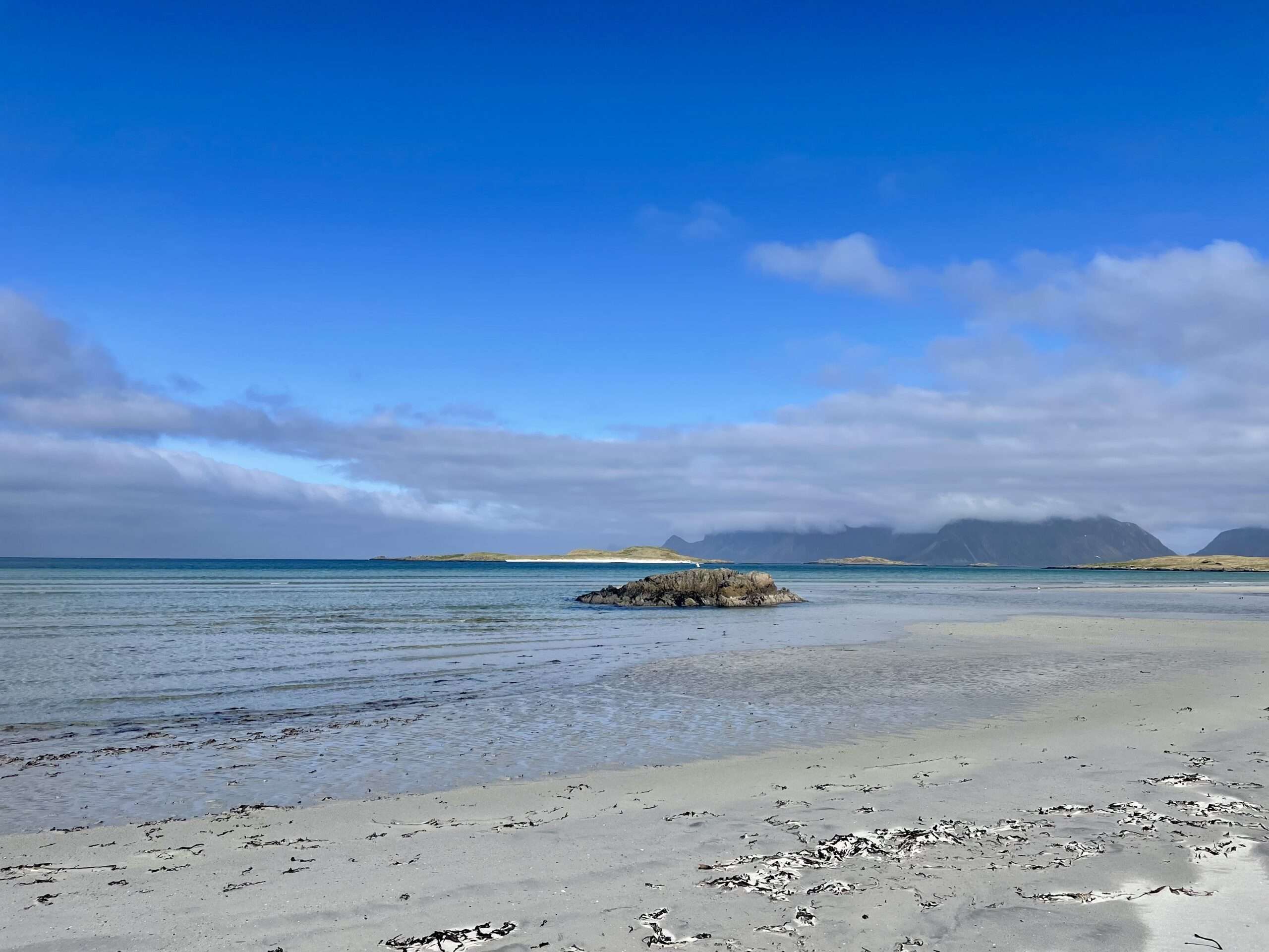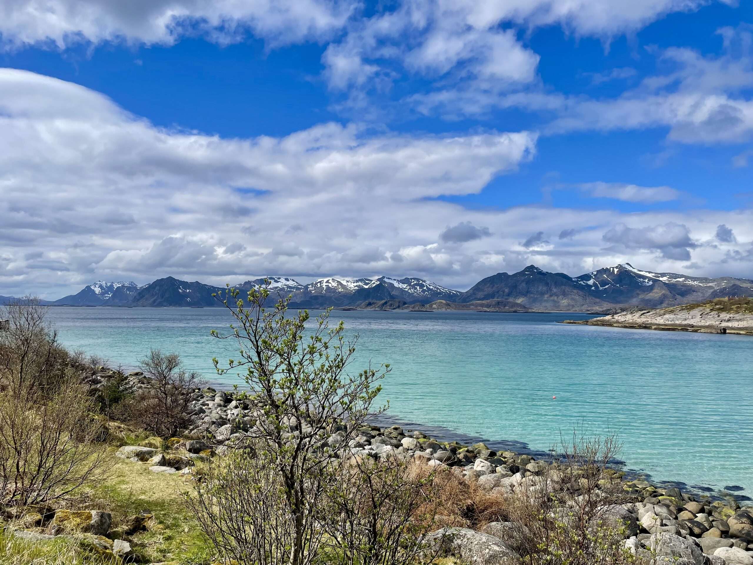 Les Lofoten sont un archipel en Norvège, dans la région polaire, situé au-dessus du cercle arctique. Cela plante le décor : Des montagnes aux sommets ciselés (presque déchiquetés) et enneigés, des plages de sable blanc, des fjords parfois turquoises (sous le soleil)… Spectaculaire ! Et tellement dépaysant. Cette semaine fut magique. De part le lieu bien sûr (des paysages que je n’avais jamais vu) et les voir avec un de mes enfants. Et j’ai eu tellement peur de ne pas pouvoir le faire (Voir post La chute) ! Sa population, aux alentours de 25 000 habitants, vit traditionnellement de la pêche et aujourd’hui du tourisme. Son cadre lui vaut de figurer, régulièrement, dans divers palmarès des plus belles îles au monde.